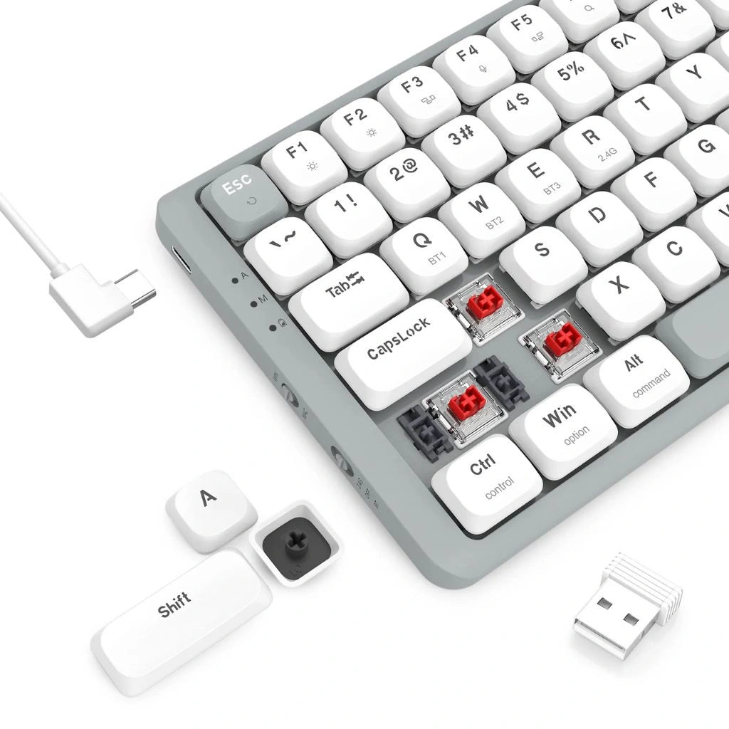 This keyboard offers versatile tri-mode connectivity, supporting wired USB-C, 2.4GHz wireless via a dedicated receiver, and Bluetooth for up to three devices. Effortlessly switch between your laptop, tablet, and phone, making it ideal for multitasking across multiple platforms.