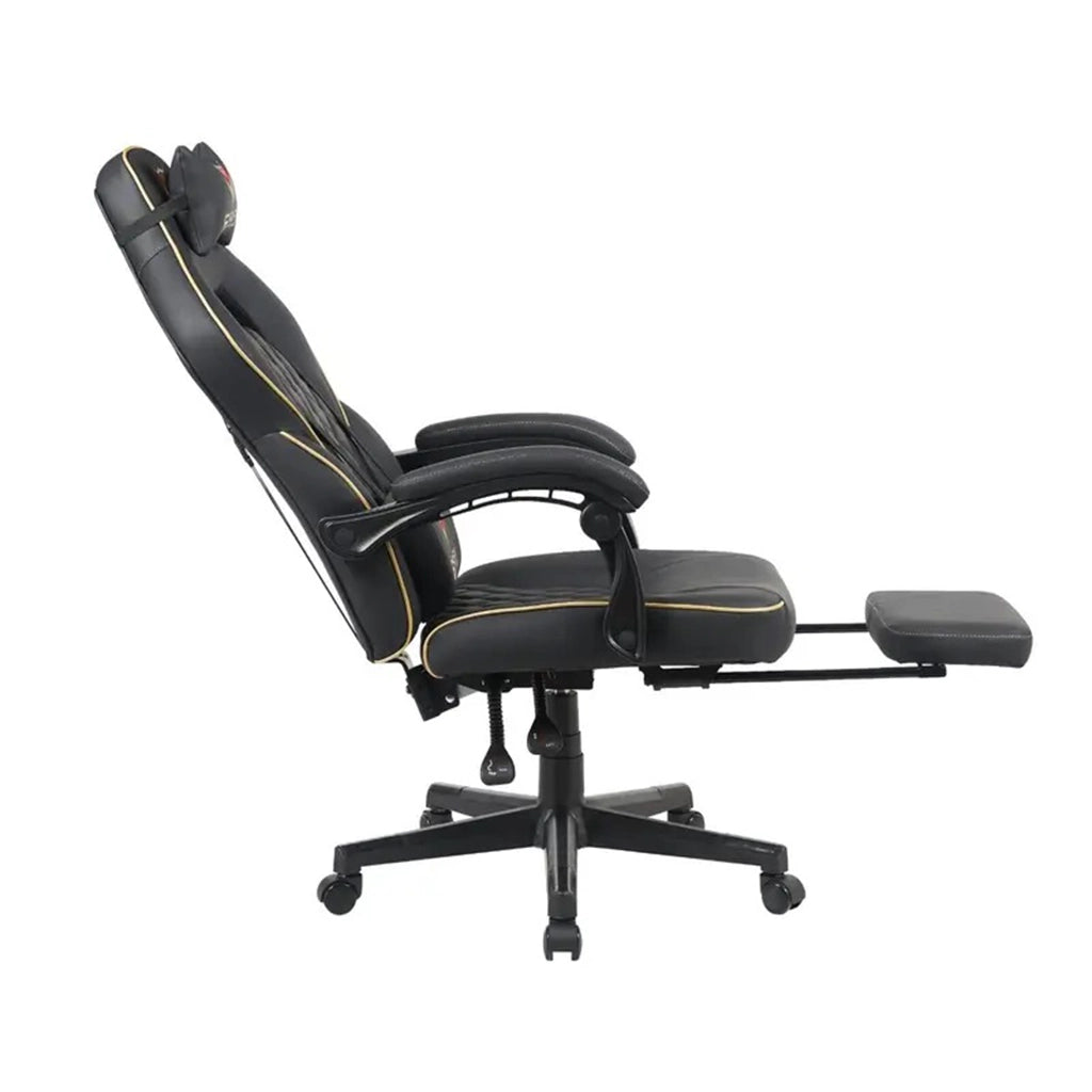 GFury KW-G6404 is a top-tier gaming chair built for players who demand exceptional comfort, luxury materials, and advanced adjustability. Designed with a premium blend of PU leather and plush fabric, it delivers a smooth, soft-touch experience while enhancing durability. The combination of moulded foam and memory foam ensures ergonomic body support, providing long-lasting comfort even during intense gaming sessions. With fully adjustable 4D armrests and a high-performance frog mechanism, this chair allows precise customization of seating angles and posture. Its robust 350mm metal base and large 75mm PU casters offer superior stability and effortless movement. Finished in a bold Black & Golden color scheme, the KW-G6404 adds power and style to any gaming setup.